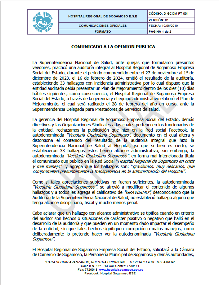 Por su parte, también está disponible el servicio de manera particular por consulta externa, cabe aclarar que este examen solamente se puede realizar durante los primeros 28 días de vida, para los interesados pueden recibir la información a través de celular 3118318828 o por medio del correo laboratorioclinico@hospitalsogamoso.gov.co.